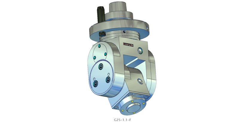 G25系列的角頭具有可根據(jù)刻度進(jìn)行無級(jí)調(diào)整的加工主軸。設(shè)置范圍從 0°(垂直)擴(kuò)展到兩側(cè)最大 100°。主軸的旋轉(zhuǎn)方向與驅(qū)動(dòng)器的旋轉(zhuǎn)方向相反。